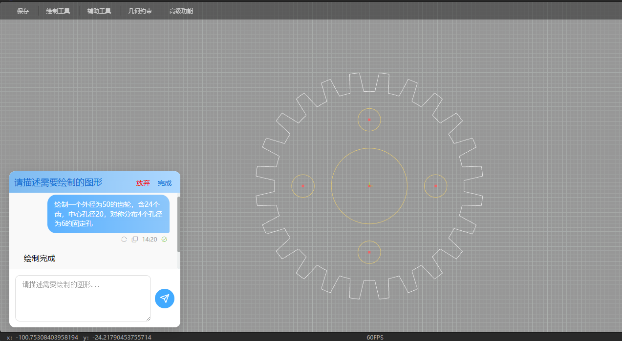 只需输入自然语言描述,即可自动生成草图图形。例如:“画一个半径为 20 的圆,旁边加一个长方形”。支持连续对话,随时补充、修改或撤销图形内容,极大提升建模效率。