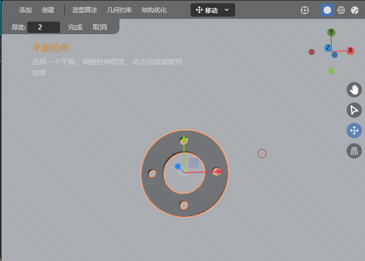 点击左上角保存按钮,进入造型界面,选中面片,使用“平面拉伸”算法生成三维模型。